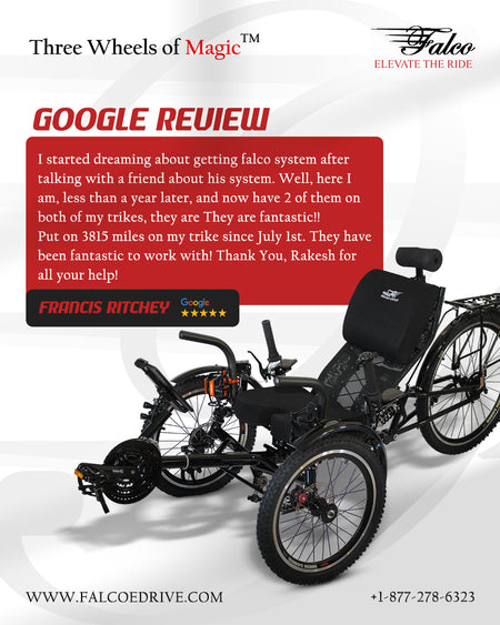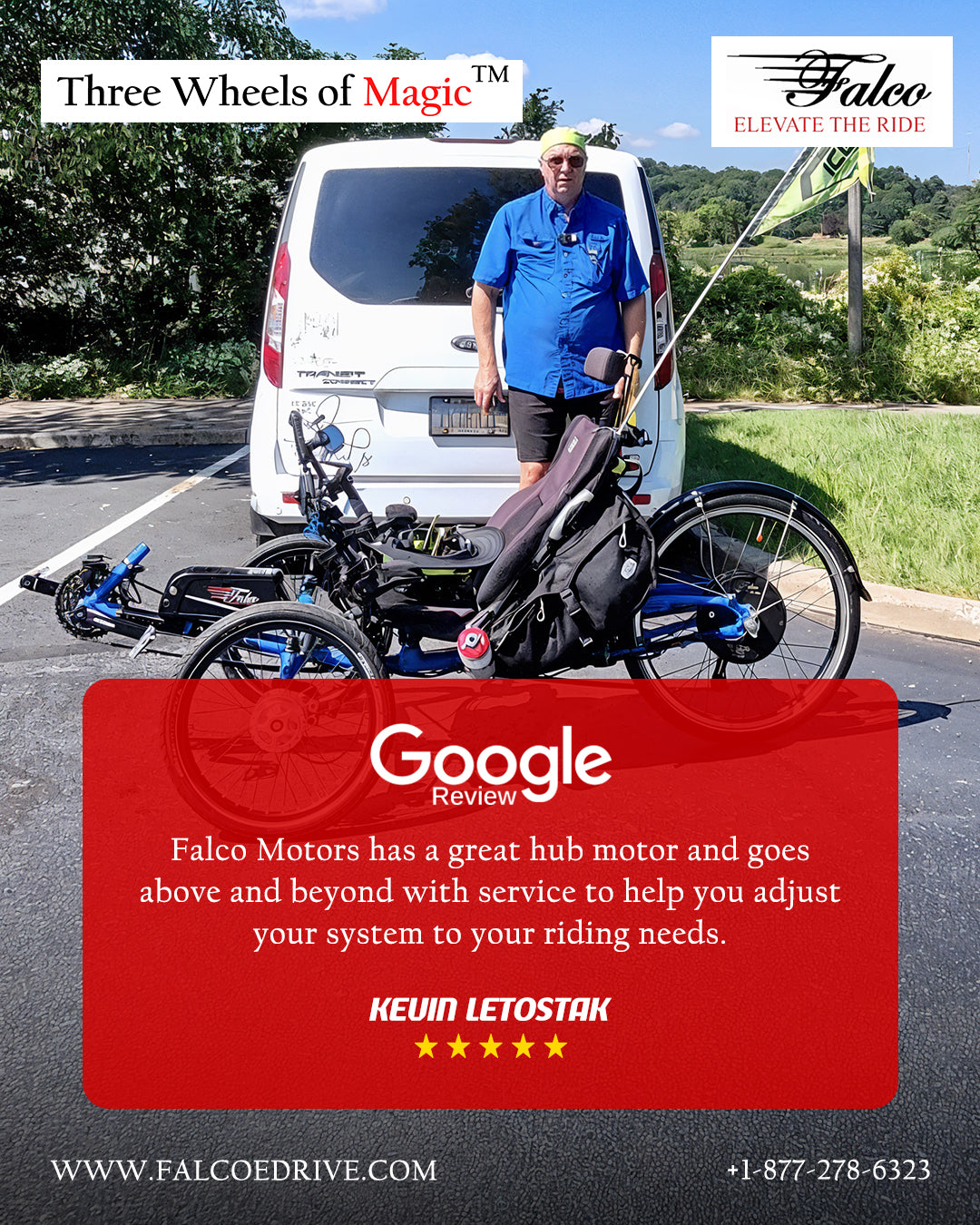 Every Falco TWM hub motor has an iron-clad five-year warranty to guarantee your utmost satisfaction and peace of mind. We believe a sound investment should stand the test of time, offering uncompromising reliability and performance. Experience the comfort of knowing you own a world-class Falco TWM Trike system that delivers exceptional performance and represents the pinnacle of reliability.